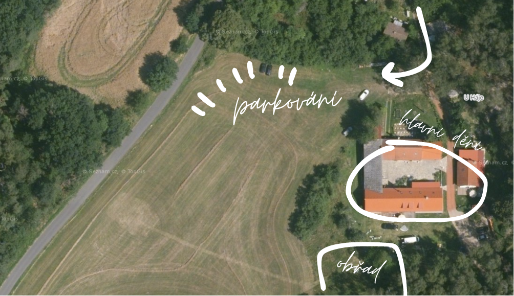 Nespočet míst k parkování je k dispozici na přilehlé louce, hned vedle statku. Dobrodruzi, milovníci spaní pod širákem nebo prostě ti, na které nezbylo ubytko uvnitř, se můžou dle libosti utábořit kdekoli na zelené louce.